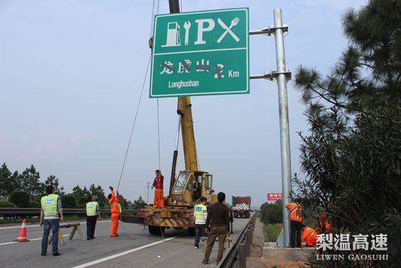 3月26日至27日,梨温维修队克服交通量大、设备老旧等种种困难,在做好路损修复工作的同时,积极配合龙虎山服务区项目办对新建服务区设计的六块引导标志牌进行了安装。