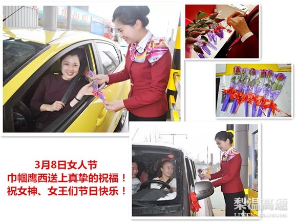 3月8日,是国际妇女节,鹰潭西收费站的姑娘们购置了一朵朵的玫瑰花,亲手包扎成花束,送给当天过往的女司乘人员,她们在赠送玫瑰的时候还送上一声声温馨的祝福。一位南昌的女士收到姑娘们送出的第一支玫瑰,开心地说道:“一支玫瑰花,温馨伴我行。你们的行动像这玫瑰花一样美丽,你们的服务如春风一样暖人!谢谢你们!”