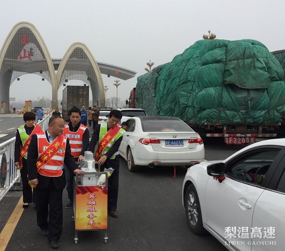 4月1日清晨,受大雾天气影响,梨温高速玉山收费站入口封道,车辆禁止上高速。熊文清班组“英雄服务车”在迷雾中出发,收费站职工走进被困人群,为等待解封的司乘朋友提供暖心、便捷的温馨服务。