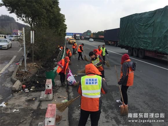 春运首日,南昌南管理中心杨梅岭养护站组织保洁队伍共30余人对车辆和旅客集中的上饶服务区周边开展春运保洁工作,受到广大司乘人员的一致好评。