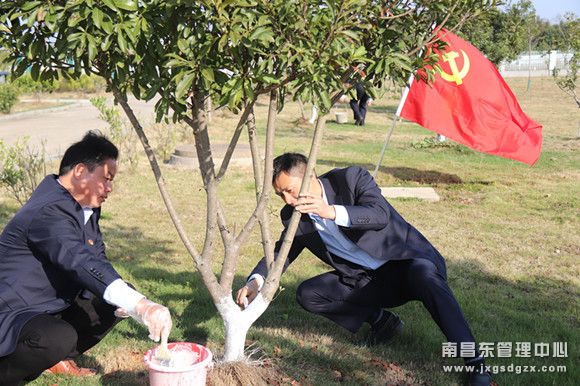 杜市收费所开展“养护树木 美化院区”树木防冻防虫涂白主题党日活动