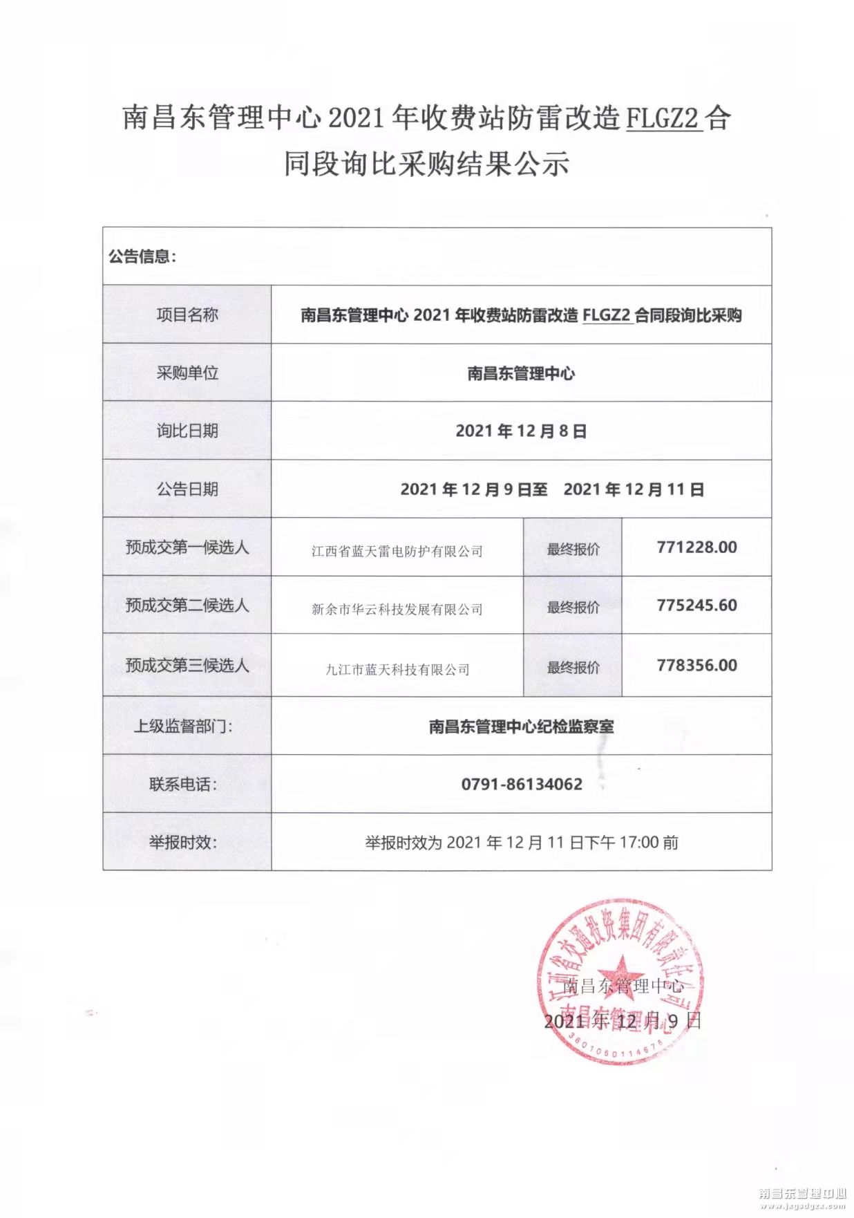 南昌南管理中心2021年收费站防雷改造项目FLGZ2标段询比公示