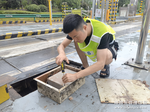 故障情况清晰,维护站人员迅速制定抢修方案,他们立即将地磅的电路关闭,以免因漏电发生安全事故。他们一边与收费站沟通启用应急预案,将受损车道关闭,及时疏导现场车辆。一边与地磅厂家售后联系,请他们立即派人前来检修地磅。在等待的同时,大家又一起清理收费广场和地磅积水,为能够快速抢修创造有利环境。