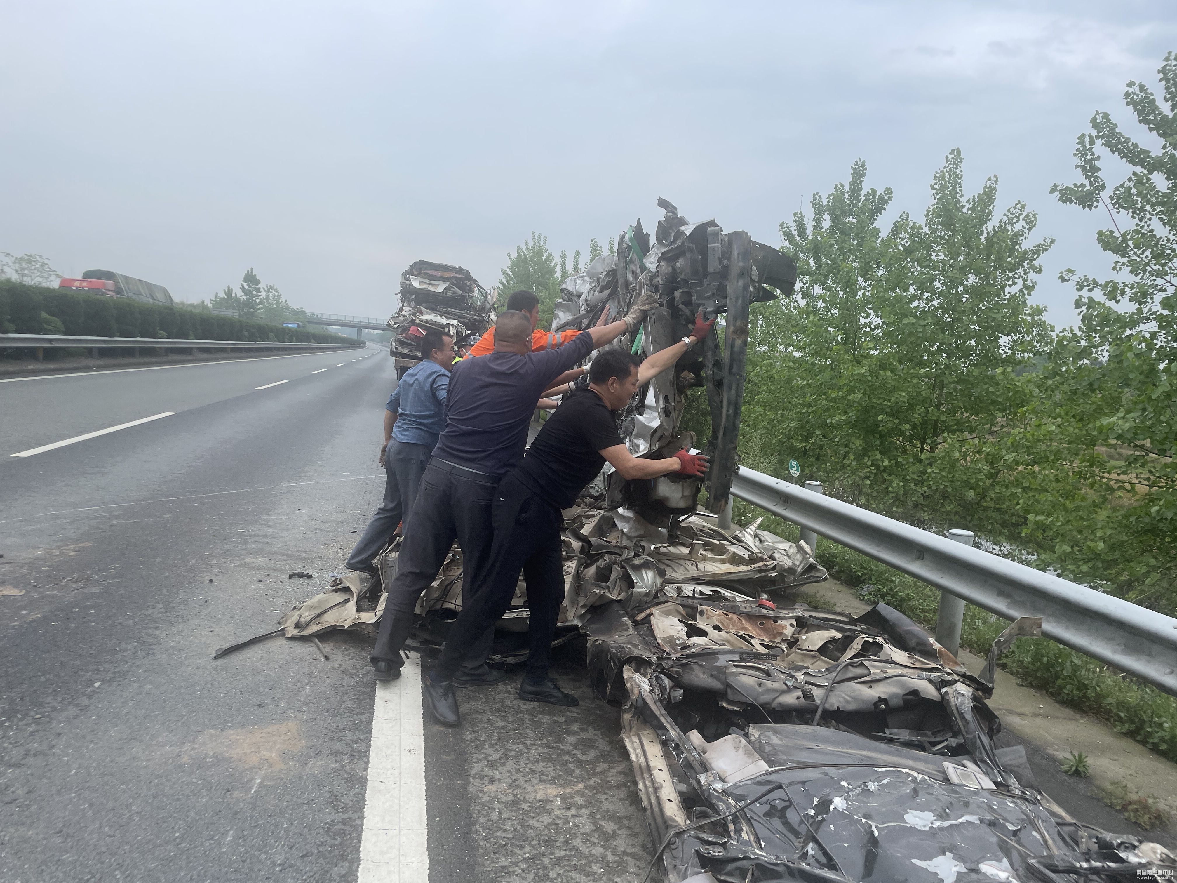 当天下午3点30分,鹰潭中队接到警报,一辆满载报废汽车外壳的大型半挂货车因钢丝绳松懈,导致约5吨货物散落至行车道及应急车道,造成高速路面通行缓慢,情况十分危险。该中队值班人员立即驾驶平板随车吊及预警车赶赴现场,抵达后,一人负责做好安全围蔽,一人负责指挥现场交通,其余人员迅速将货物一块块地翻转至应急车道,再用绑带将货物捆好,使用随车吊将货物吊至平板拖车上。4点20分,现场突发大雨,救援人员为了尽快疏通路面,只能冒雨加快作业,2个小时后,5吨报废汽车外壳全部成功装好车。同时,救援员也协助司机将其车上剩余货物重新捆绑,确认绳索牢固后,一同驶离现场前往鹰潭服务区,此时,高速路面恢复了正常通行。