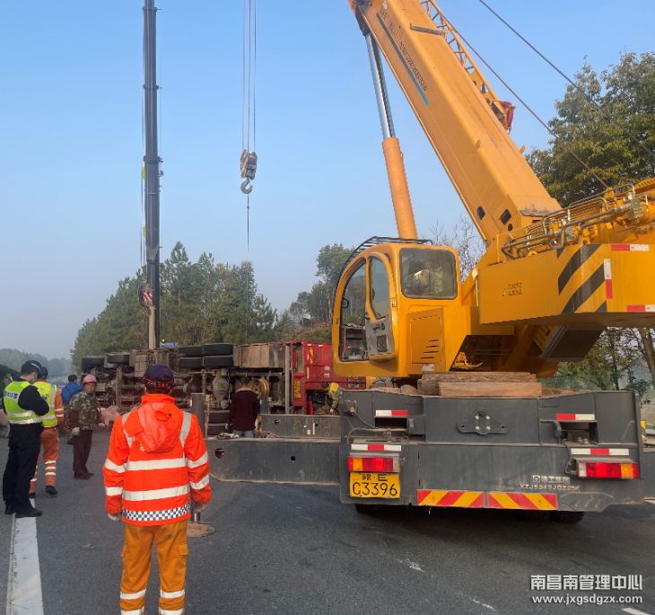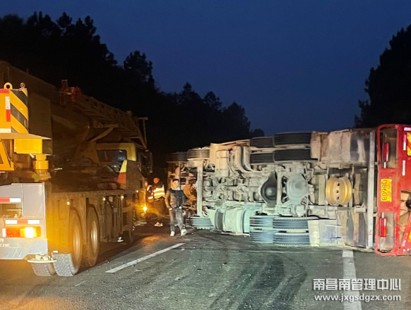 正当大家准备离开现场时,又是一声急促的铃声,沪昆高速南昌方向K645公桩处一辆大货车发生侧翻,整辆车横跨三车道,道路全部堵死。救援人员立即马不停蹄的赶往K645侧翻现场。