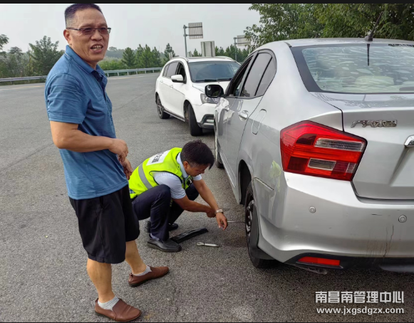 经交流得知,原来该小车由于车辆供电系统故障和轮胎爆裂无法前行。正当司机无计可施时,值班站长化身修车工主动找来修车工具,帮助司乘更换轮胎,并用自己的车辆为司机搭电,经过1个多小时的维修,小车终于恢复正常。