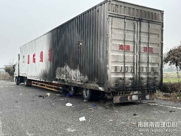 2月27日春暖乍寒,一辆浙牌大型货车因后轮轴承出现故障,导致温度过高引发车辆火灾,经车辆救援大队罗湖中队拖下高速,滞留在南昌南管理中心罗湖收费站出口广场等待处理后续工作。